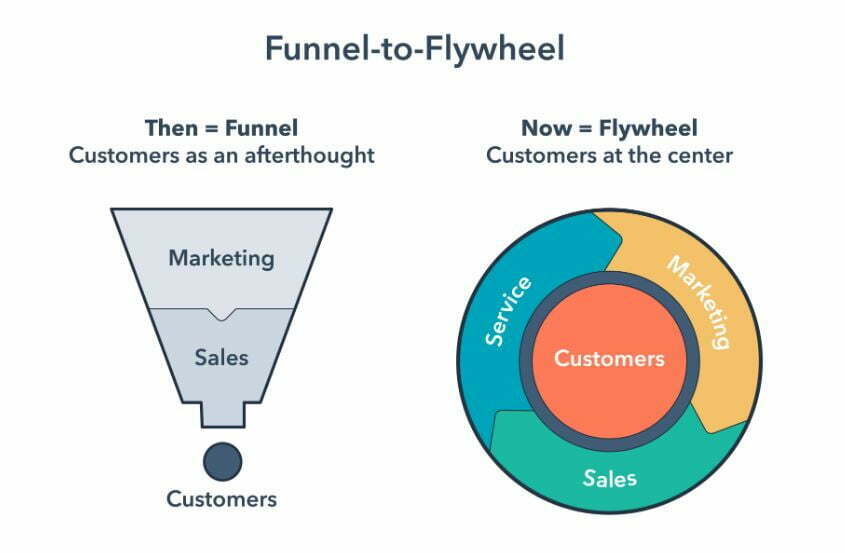 HubSpot werkt vanuit de Inbound Marketing Methode en het Flywheel visualiseert dit. In het kort komt het erop neer dat de klant niet, zoals in een funnel, het ”eindprodukt” is, maar de klant staat centraal in de onderneming en in dus in het zogenaamde Flywheel. HubSpot biedt een tool voor een naadloze overgang van Marketing naar Sales tot Service.