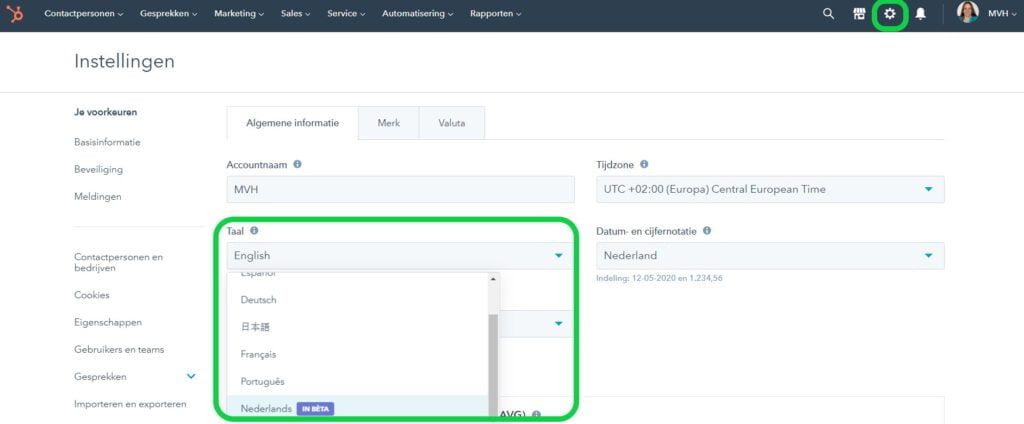 Ben je al een HubSpot gebruiker? Zo wijzig je de taalinstellingen: