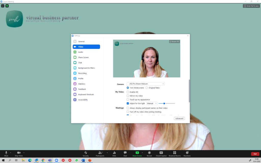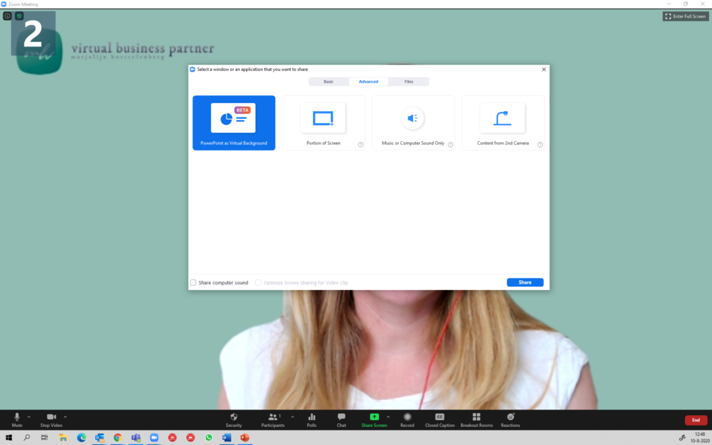 - Selecteer Powepoint as a Virtual Background”