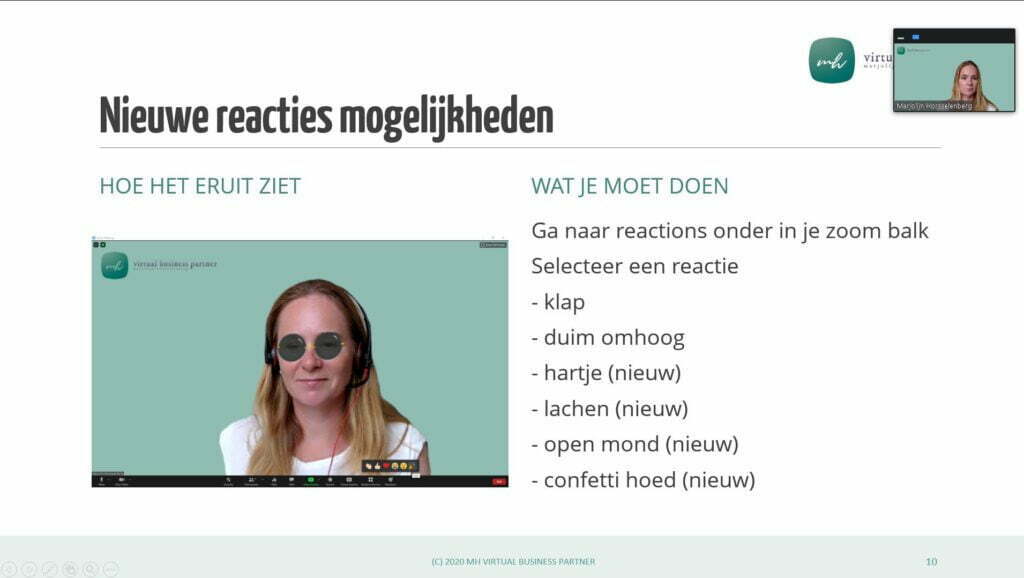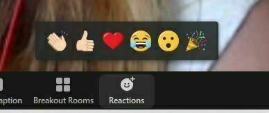 Tot voor kort konden we tijden de meeting door middel van reacties virtueel reageren. We konden klappen of onze duim opsteken. ZOOM heeft nu 4 nieuwe reactie toegevoegd: Hartje (heart), Lachend smiley (joy), Open Mond (open mouth) smiley en het confettihoedje (tada).