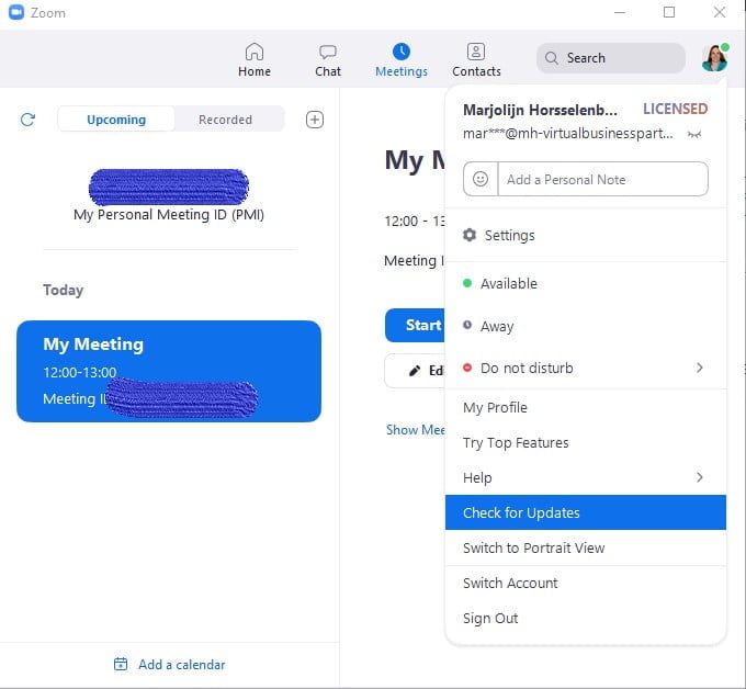 Om de nieuwe features in ZOOM te kunnen gebruiken moet je eerst de ZOOM desktop client updaten naar versie 5.2.0. Check voor updates, installeer deze en start de ZOOM Desktop Client opnieuw.